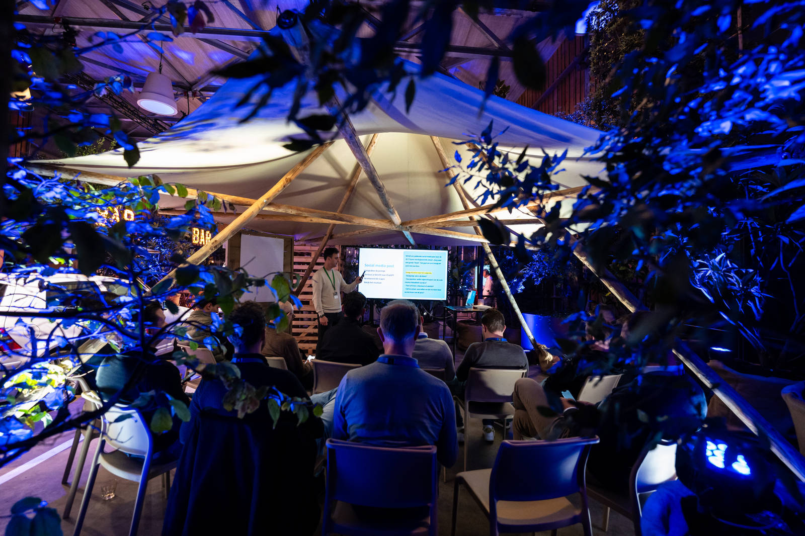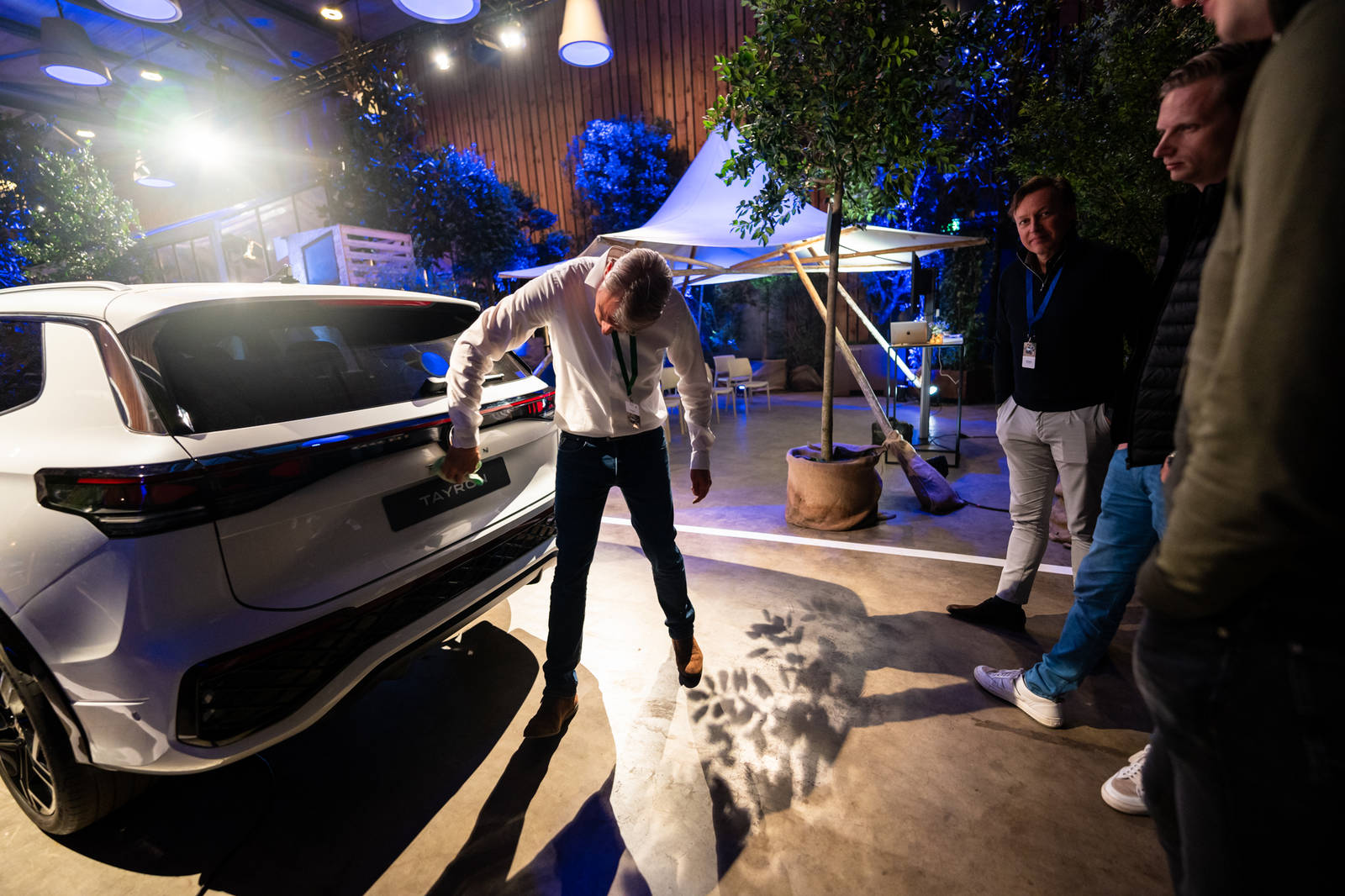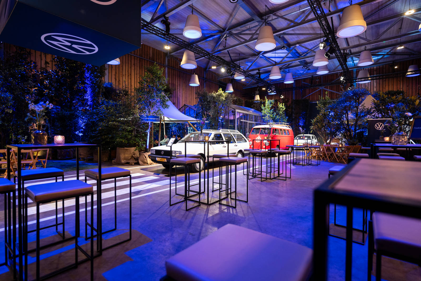 De grote hal was knus, de ruimtes voor de workshops pasten perfect, onder meer met Zweedse tentjes en een kas. Het mooiste was dat we een echte automotive-sfeer konden creëren. Eyecatcher was natuurlijk de snelweg, met een paar schitterende oude Volkswagen-modellen. Ook hadden we wegwijzers richting de workshops in de vorm van verkeersborden, en een oranje alarmlicht dat het einde van een programma aangaf. Dat soort details zijn natuurlijk goud.”